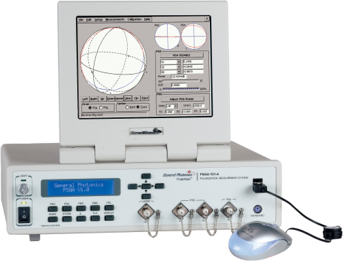 The PSGA-101A system consists of 3 main parts: a tunable laser, a polarization state generator (PSG) that can generate the 6 basis polarization states commonly used for measurement, and a polarization state analyzer (PSA) to perform the polarization measurements. The PSG and PSA are based on patented magneto-optic polarization generation and analysis technology that enables extremely accurate measurement of polarization dependent loss (PDL) and polarization mode dispersion (PMD) vs. wavelength. In addition, the PSGA-101A can perform other measurements such as state of polarization (SOP) and degree of polarization (DOP) monitoring, polarization extinction ratio (PER) measurement, Mueller Matrix measurement of devices or components, and birefringence measurement in spun fiber.